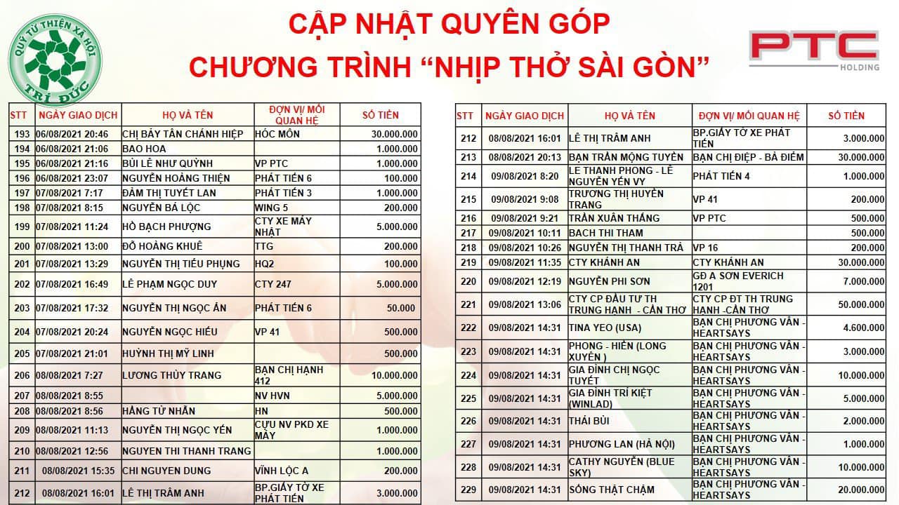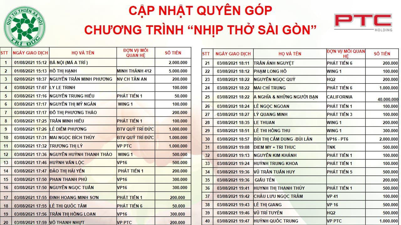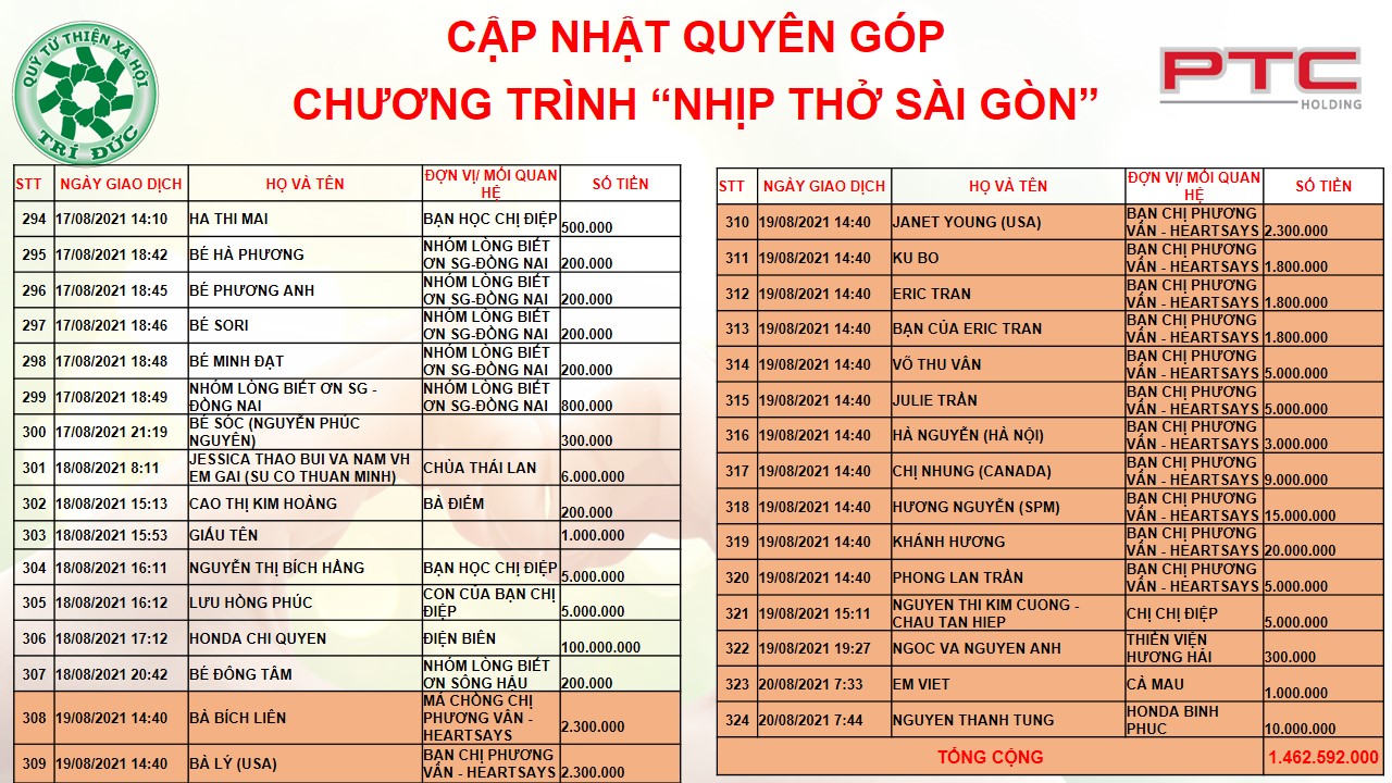 Tính đến ngày 20/08/2021, Chương trình “NHỊP THỞ SÀI GÒN” đã nhận được rất nhiều khoản góp duyên từ hơn 324 Mạnh Thường Quân trong và ngoài nước, với TỔNG SỐ TIỀN gần: 1 tỷ 463 ( Một tỷ bốn trăm sáu mươi ba triệu đồng).