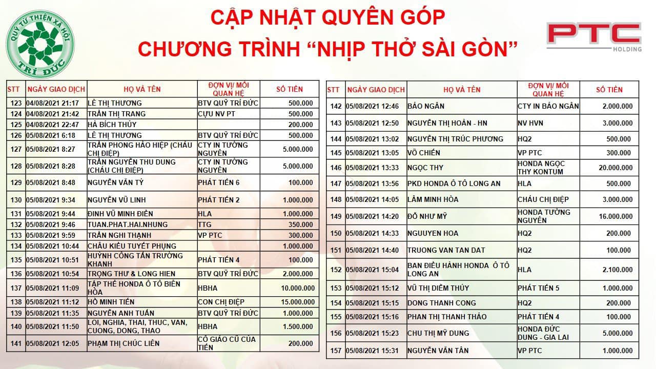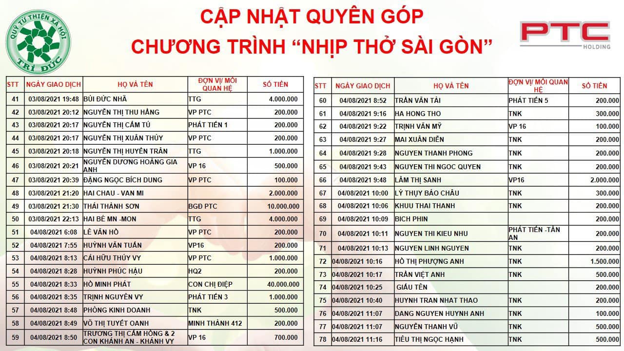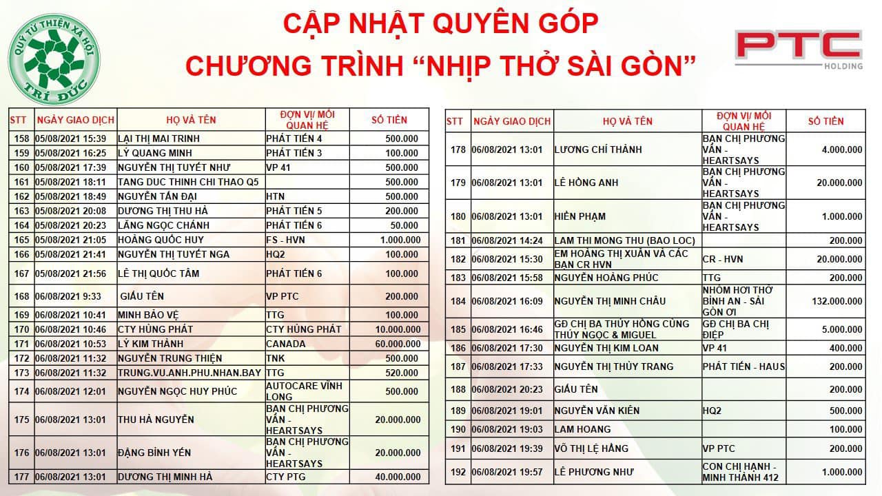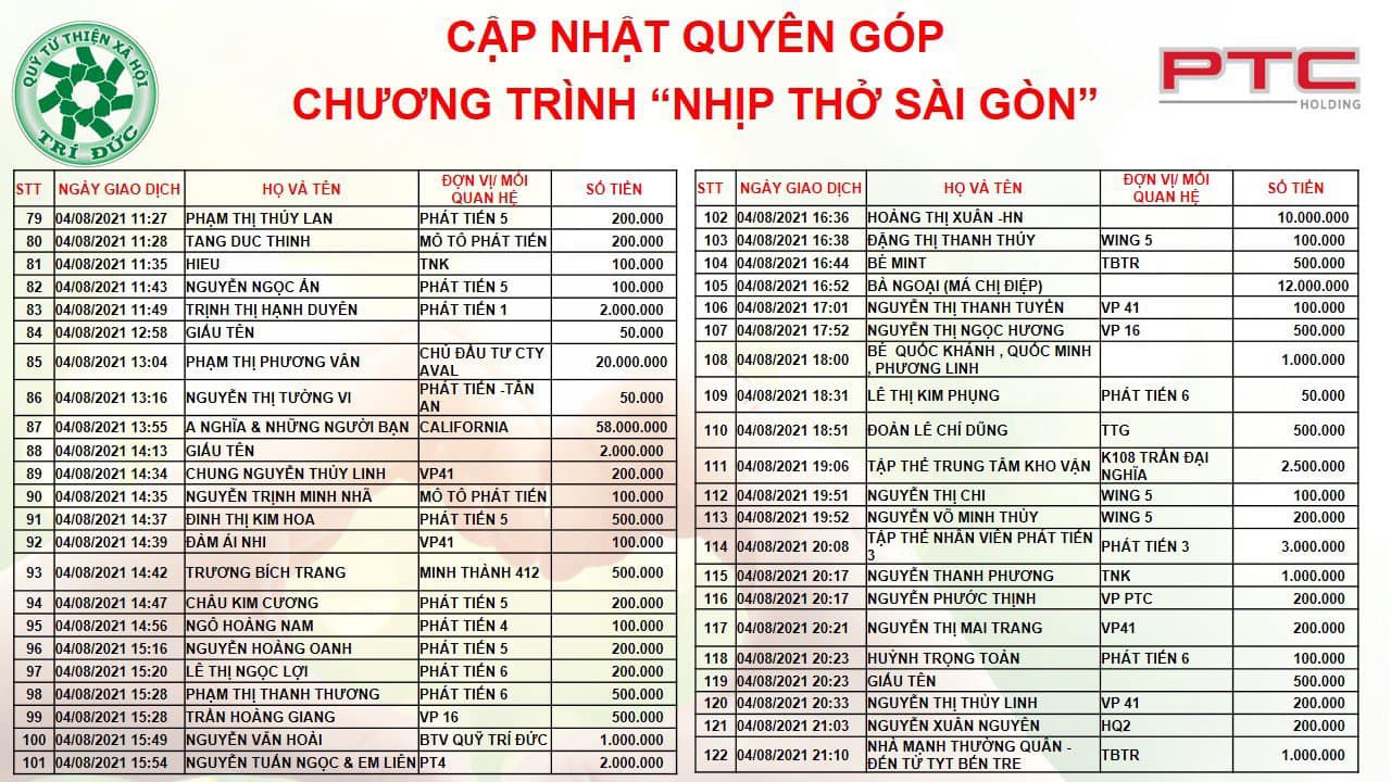 Tính đến ngày 20/08/2021, Chương trình “NHỊP THỞ SÀI GÒN” đã nhận được rất nhiều khoản góp duyên từ hơn 324 Mạnh Thường Quân trong và ngoài nước, với TỔNG SỐ TIỀN gần: 1 tỷ 463 ( Một tỷ bốn trăm sáu mươi ba triệu đồng).